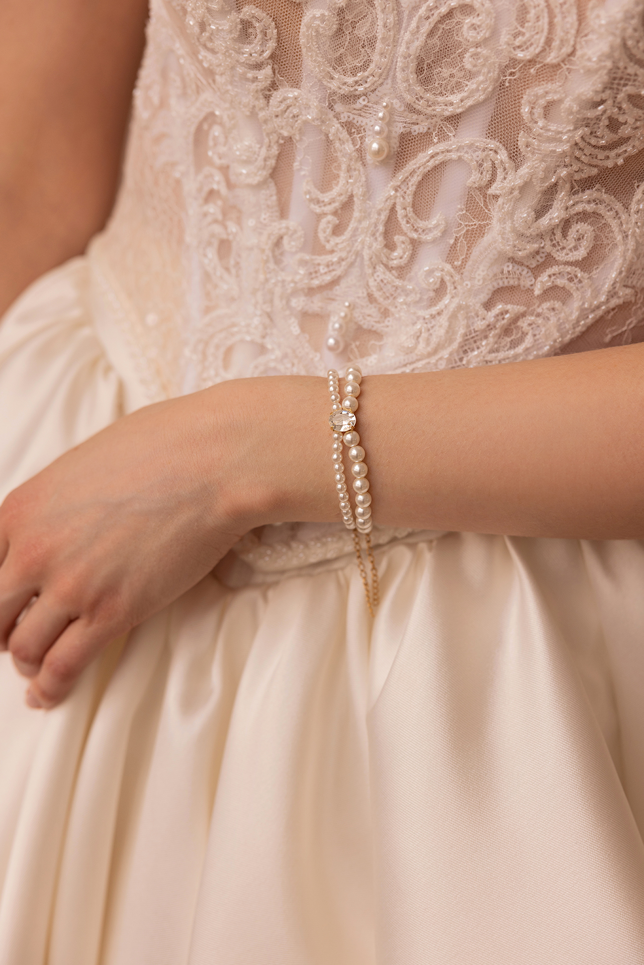 Bransoletka podwójna z perłami i kryształkiem “Lunaria”