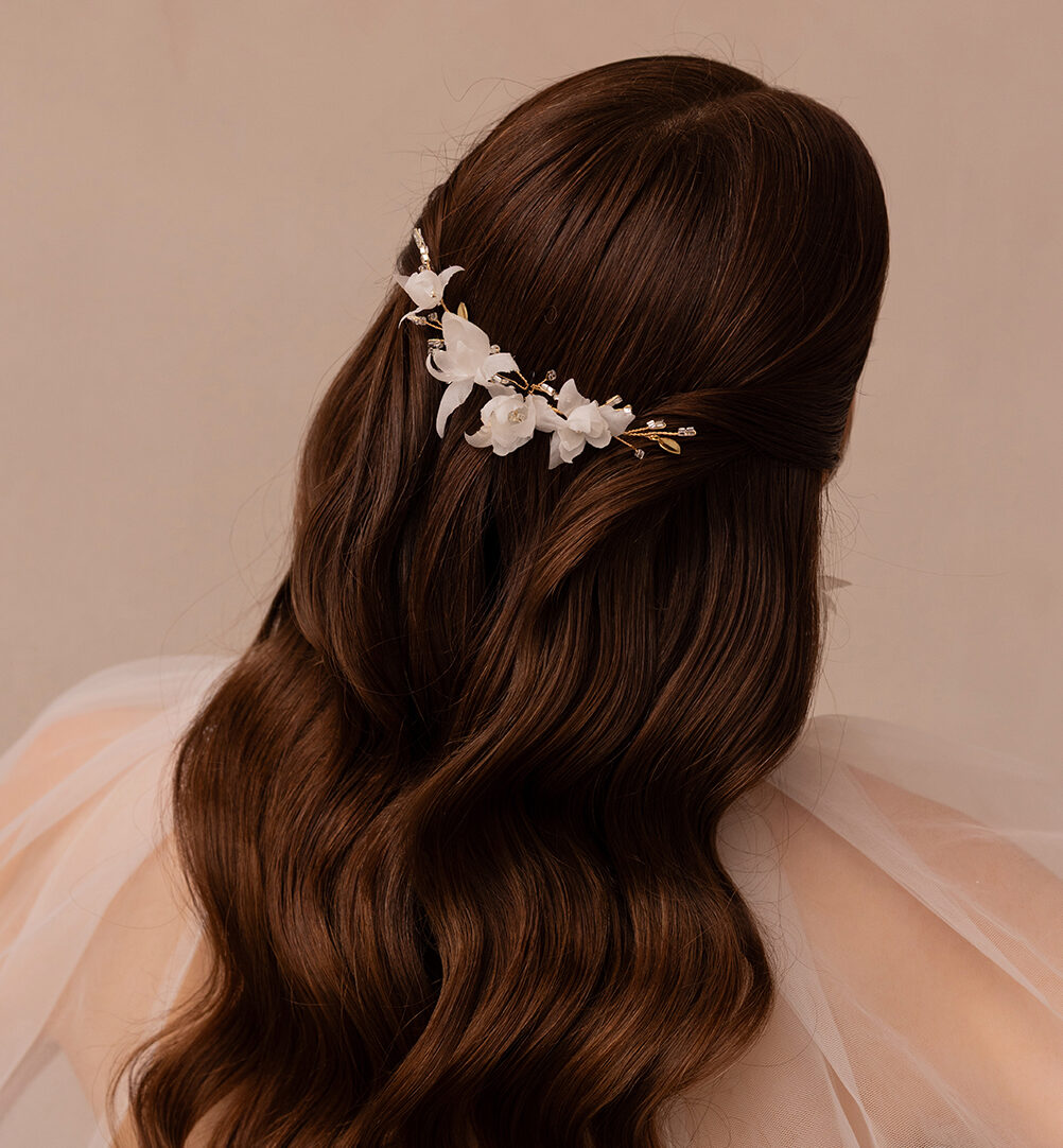 Gałązka ślubna do włosów z drobnymi kwiatkami. Jest bardzo delikatna i romantyczna. Wpasuje się w styl rustykalny, romantyczny, czy leśny. Dla Panien Młodych poszukujących kwiatowej biżuterii ślubnej. Idealna propozycja do wpięcia w koka, niskie upięcie, czy rozpuszczone włosy w formie pół – opaski. Drobne kwiatki dodają naturalności i podkreślają upięcie.